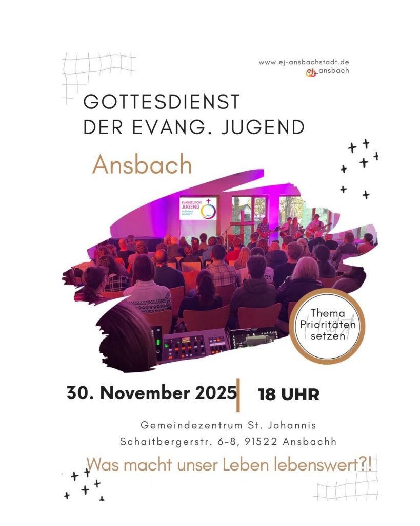 Save the date. Herzliche Einladung zu unseren interaktiven Jugendgottesdiensten der EJ Ansbach. Jugendgottesdienste für alle Jugendlichen und jung Gebliebenen. Im Anschluss mit Snacks, Getränken und einer ordentlichen Portion Gemeinschaft zum Schnacken und Spaß haben.